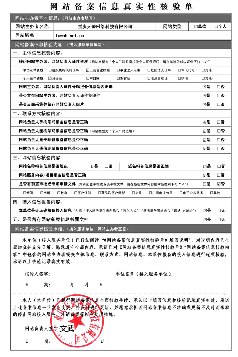 如,我們公司法人是文武,那么,網(wǎng)站備案的核驗(yàn)單填寫范例如下: