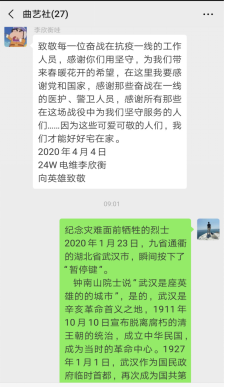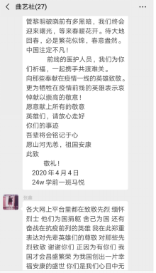 本次悼念活動(dòng)分為兩部分:1.在早晨九點(diǎn)五十之前在微信群發(fā)布緬懷先烈文字,向疫情期間犧牲的最可愛的人致敬;2.全體社團(tuán)成員在家衣著整齊,十點(diǎn)整進(jìn)行默哀儀式。