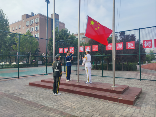 早晨7:40分,升國旗儀式正式開始。國旗護(hù)衛(wèi)隊(duì)隊(duì)員身著統(tǒng)一制服,以嶄新的面貌、昂揚(yáng)的精神亮相。隨著國歌聲響,旗手振臂一揮,五星紅旗冉冉升起,全體師生齊唱國歌,行注目禮,滿懷深情向國旗致以最崇高的敬意,迎接新的學(xué)期,新的開始。