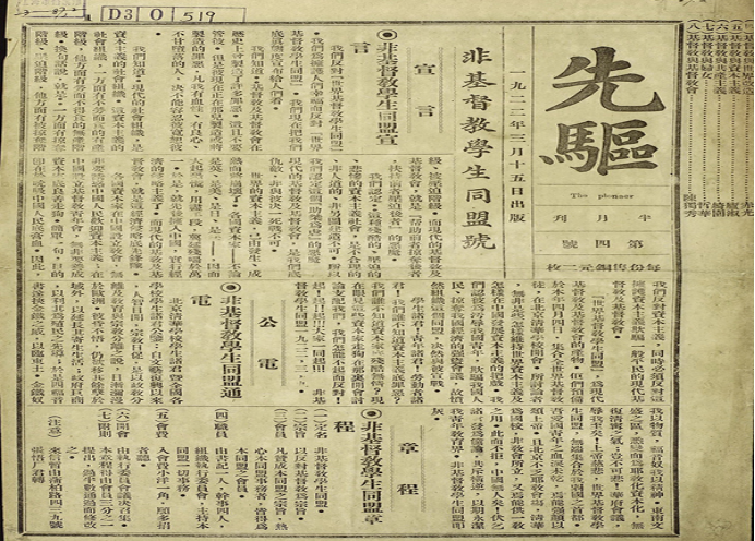 (1922年3月15日,《先驅(qū)》第四號(hào)作為“非基督教學(xué)生同盟號(hào)”出版,在這期專號(hào)上,刊登了非基督教學(xué)生同盟的宣言和章程。)