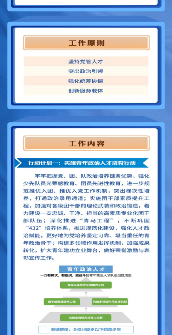 文件要求,要始終堅(jiān)持“黨管人才”“黨管青年”原則,緊密圍繞黨的人才工作大局,抓好后繼有人這個(gè)根本大計(jì),最廣泛地團(tuán)結(jié)、凝聚青年人才,為黨的事業(yè)提供堅(jiān)強(qiáng)的人才保證。要始終堅(jiān)持旗幟鮮明講政治,加強(qiáng)對(duì)各類青年人才的政治引領(lǐng),把為黨培養(yǎng)青年政治人才放在首位,培育并磨煉各類青年人才的堅(jiān)定共產(chǎn)主義理想信念,充分彰顯共青團(tuán)的政治屬性與組織功能。要緊緊抓住35周歲以下青年人才培養(yǎng)、凝聚、舉薦等關(guān)鍵環(huán)節(jié),立足于黨和國(guó)家事業(yè)發(fā)展需要,遵循青年人才發(fā)展規(guī)律,強(qiáng)化統(tǒng)籌協(xié)調(diào),拓展外部工作空間,提升內(nèi)部運(yùn)行效能,進(jìn)一步解放思想,不斷創(chuàng)新工作內(nèi)容、方式和載體,持續(xù)優(yōu)化健全團(tuán)內(nèi)各層級(jí)、各領(lǐng)域高效協(xié)同配合的工作機(jī)制;加強(qiáng)資源整合與供給,推動(dòng)青年人才工作更好融入中心大局,形成為黨育人的工作合力和核心競(jìng)爭(zhēng)力,發(fā)揮共青團(tuán)聯(lián)系青年的橋梁紐帶作用,著力打造符合時(shí)代要求、青年需求的工作矩陣,關(guān)心青年成長(zhǎng),幫助青年成才。