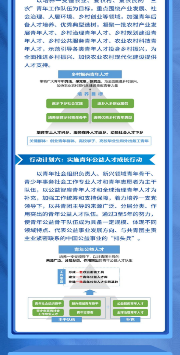 為深入貫徹習(xí)近平總書(shū)記在慶祝中國(guó)共產(chǎn)主義青年團(tuán)成立100周年大會(huì)上的重要講話精神、習(xí)近平總書(shū)記關(guān)于做好新時(shí)代人才工作的重要思想和中央人才工作會(huì)議精神。近日,共青團(tuán)中央印發(fā)了《共青團(tuán)做好新時(shí)代青年人才培養(yǎng)工作的行動(dòng)計(jì)劃》,并發(fā)出通知,要求各省級(jí)團(tuán)委、各行業(yè)團(tuán)(工)委抓好貫徹落實(shí)。