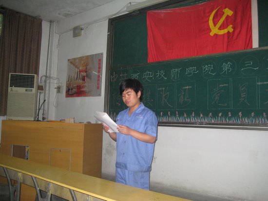 值此建黨88周年之際,中共西安技師學(xué)院第三黨支部預(yù)備黨員轉(zhuǎn)正、接收新黨員大會(huì)于2009年6月29日下午在101教室召開。大會(huì)通過了歐朝紅同志轉(zhuǎn)為中共正式黨員,趙軍朋等八名同志接收為中共預(yù)備黨員。