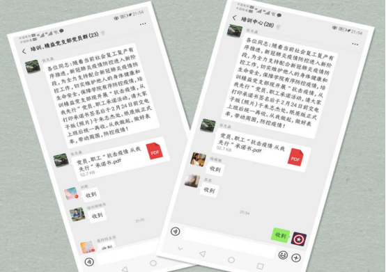 臨近新學(xué)期開(kāi)學(xué),為全力支持配合新型冠狀肺炎疫情防控工作,切實(shí)維護(hù)自身及他人的身體健康和生命安全,防止疫情擴(kuò)散,保障學(xué)院有序防控疫情,培訓(xùn)精益黨支部近日組織全體黨員、職工開(kāi)展了“抗擊疫情,從我先行”承諾活動(dòng),大家通過(guò)支部及部門微信工作群認(rèn)真學(xué)習(xí)疫情防控有關(guān)通知文件精神,落實(shí)學(xué)院疫情防控工作的各項(xiàng)安排,守初心、擔(dān)使命,以實(shí)際行動(dòng)體現(xiàn)自身的責(zé)任和擔(dān)當(dāng),為打贏疫情防控阻擊戰(zhàn)作出應(yīng)有貢獻(xiàn)。(圖文:培訓(xùn)中心 朱志杰)