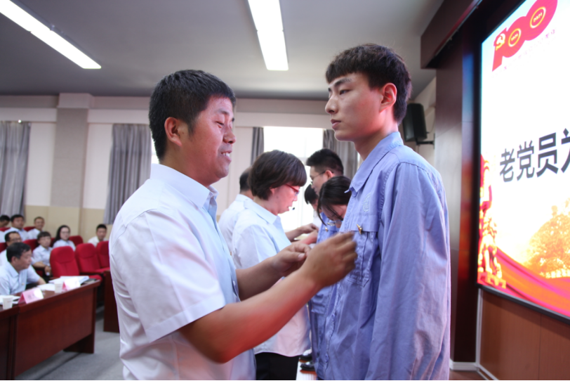 張民等5名老黨員同志為新黨員代表佩戴了黨徽,傳遞共產(chǎn)黨員的責(zé)任、理想和信念;現(xiàn)代服務(wù)系教師陳建華代表新發(fā)展黨員發(fā)言,表示全體新黨員將以吾輩之青春,踐行入黨之初心。