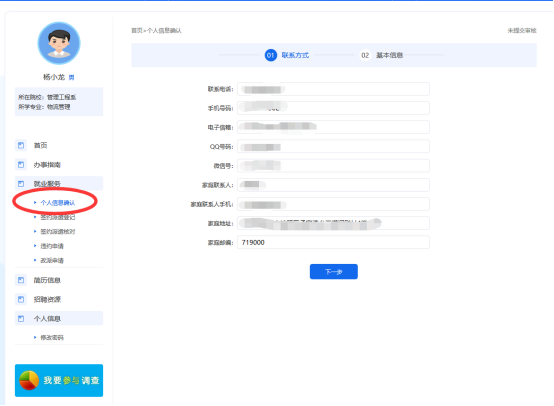 a.點擊左側(cè)功能菜單中的“就業(yè)服務(wù)-個人信息確認(rèn)”,打開個人信息確認(rèn)頁面: