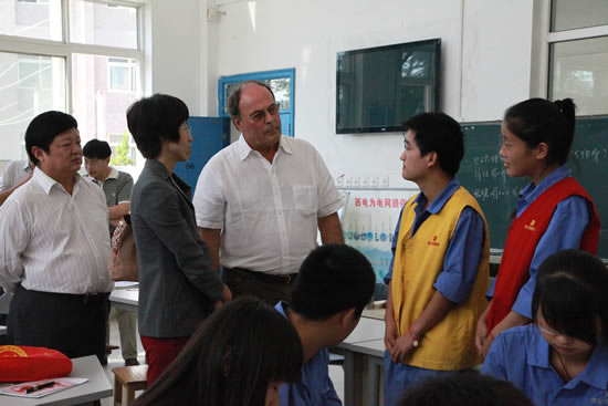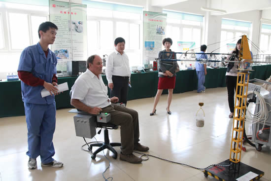 隨后,杰克·杜塞爾多普一行在李長江院長的陪同下,參觀了高壓電氣系、工業(yè)自動(dòng)化系、汽車工程教研室的課堂教學(xué)與實(shí)訓(xùn)中心,以及校辦工廠豪特公司生產(chǎn)車間和我院現(xiàn)代化的大型學(xué)生餐廳。在高電系實(shí)習(xí)教室,都塞爾多普主席和正值擔(dān)任13G輸變電高電2班安全員的高陽陽、高曉燕同學(xué)的交流中,杜塞爾多普主席問到“你為什么選擇這所學(xué)校?之前有沒有來過這所學(xué)校?你了解你的專業(yè)嗎?”兩位同學(xué)在回答中對(duì)專業(yè)的了解和對(duì)職業(yè)的熱愛使杜塞爾多普主席對(duì)我院學(xué)生刮目相看、連連稱贊。當(dāng)杜塞爾多普主席參觀到我院預(yù)備技師班的作品展室時(shí),饒有興趣的親自操作了我院學(xué)生自己研制的塔式起重機(jī)模型,并給予高度評(píng)價(jià)。