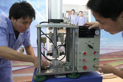 學院預備技師班畢業(yè)生正在調(diào)試自己設(shè)計制作的四柱式氣動液壓機