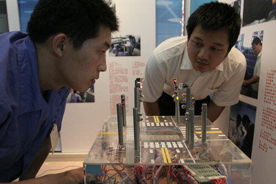 學院預備技師班畢業(yè)生正在調(diào)試自己設(shè)計制作的交通燈控制模型