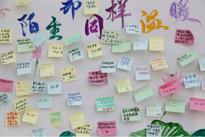 本次環(huán)節(jié)中,最受歡迎的是“祝福陌生人”。該活動(dòng)以學(xué)生在展板給陌生人留言的方式,幫助學(xué)生在溝通中減少誤解,不懼表達(dá),悅納自我。在留言區(qū),每個(gè)同學(xué)都寫(xiě)下對(duì)陌生人的祝福話語(yǔ),隨后進(jìn)行張貼,大家用一顆真誠(chéng)的心溫暖他人,感受人與人之間的善良和真誠(chéng)。