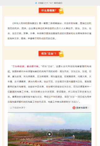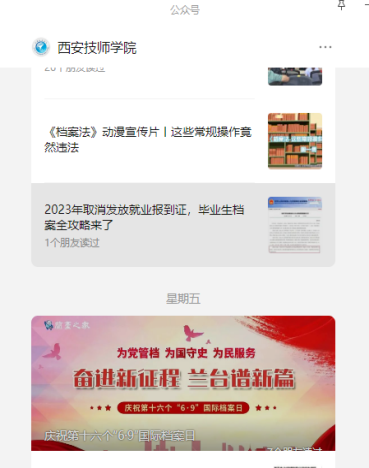 此外,學院還利用電子屏、公眾號等平臺向師生展播國家檔案局制作的宣傳片“逐夢蘭臺”,并在公眾號上連續(xù)推送《檔案法》動漫宣傳片、畢業(yè)生檔案攻略等與師生息息相關(guān)的檔案知識,不僅拉近與師生之間的聯(lián)系,將檔案知識送到師生身邊。還增強了師生的檔案法制觀念和檔案意識,加強對民生檔案重要性的認知,實現(xiàn)了“國際檔案日”宣傳活動的預期目標,使檔案工作更加深入人心。