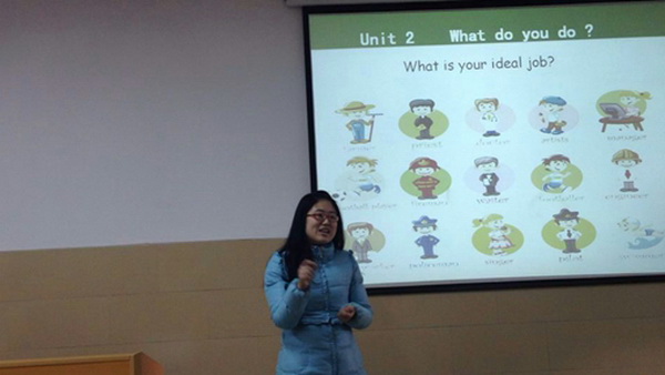 韓璟老師在講“What do you do?”設(shè)計(jì)合理、展示直觀的職業(yè)介紹以及情景導(dǎo)入使單調(diào)乏味的語(yǔ)言學(xué)習(xí)也植入了德育教育和人文關(guān)懷。