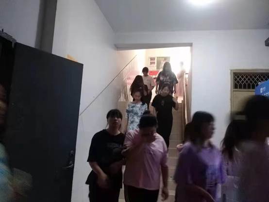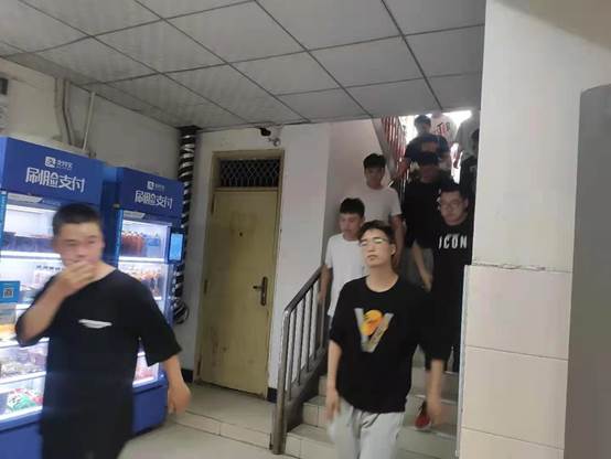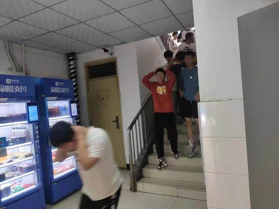 演練期間,學(xué)生們在宿舍聽到逃生信號,應(yīng)急管理人員組織學(xué)生從各自公寓樓內(nèi)有序向集結(jié)點(diǎn)撤離,班主任、教官斷后逐個(gè)清理樓層,最后撤離現(xiàn)場。